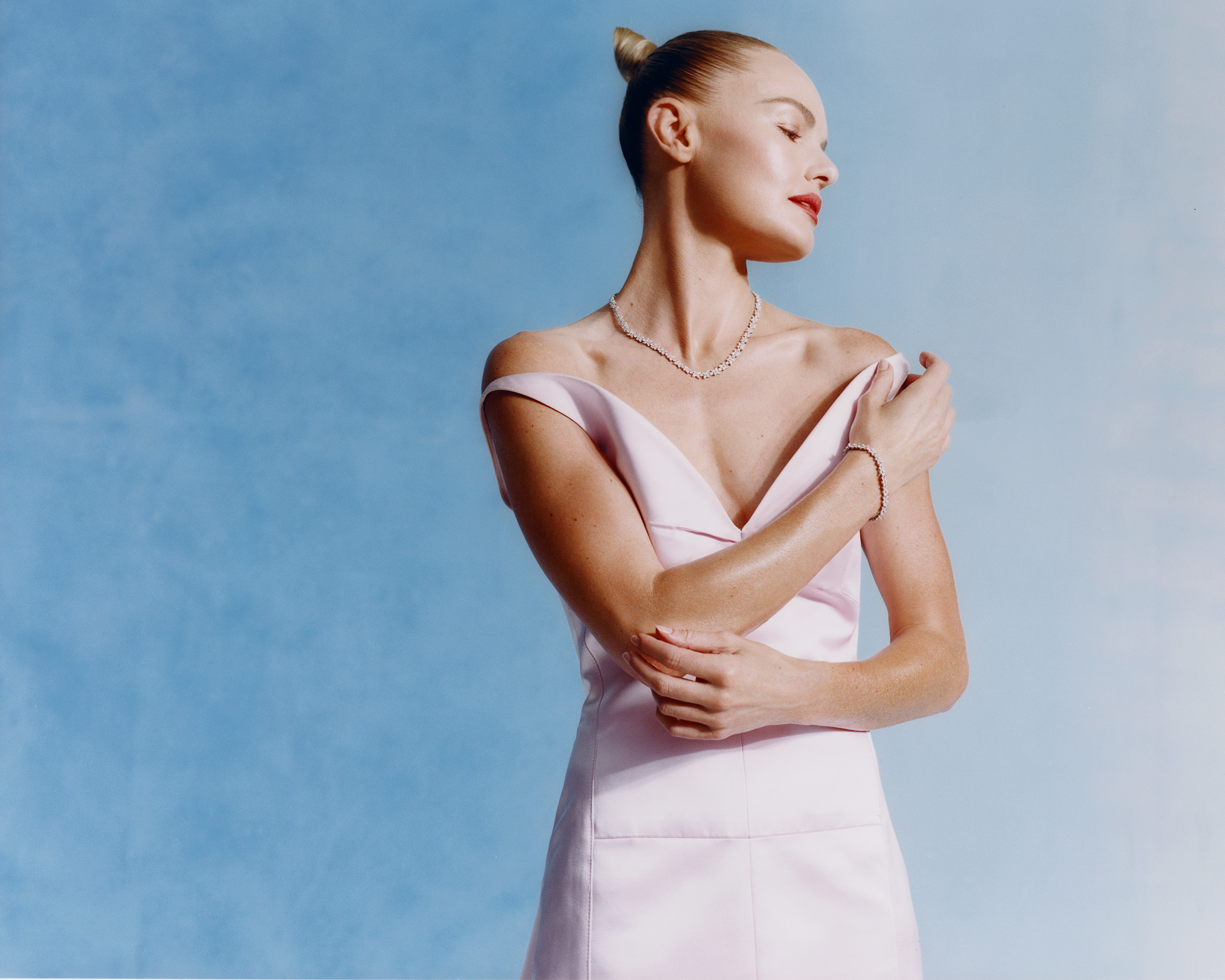 The concept behind the shoot was refined minimalism, removing distractions to reveal the pure essence of style. Set against a long blue gradient backdrop, every detail was intentional, allowing the simple palette of pink and blue to shine while highlighting Kate Bosworth’s natural confidence. By focusing solely on her presence, the shoot invites a conversation about how we define, embrace, and share our own unique sense of style.